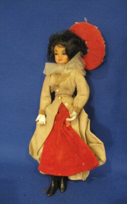 Dress, coat, stand, shoes, newsletters, sunglasses, bathing suit, #850. Mattel, 1959. With box. 12"